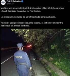 Este hecho se suma a otros incidentes viales: una menor de 10 años murió y su hermana quedó lesionada tras ser atropelladas en el cantón Melara, en La Libertad, de acuerdo con el reporte de la PNC La institución detalló que las niñas fueron arrolladas mientras transitaban por la carretera Litoral la noche del domingo.