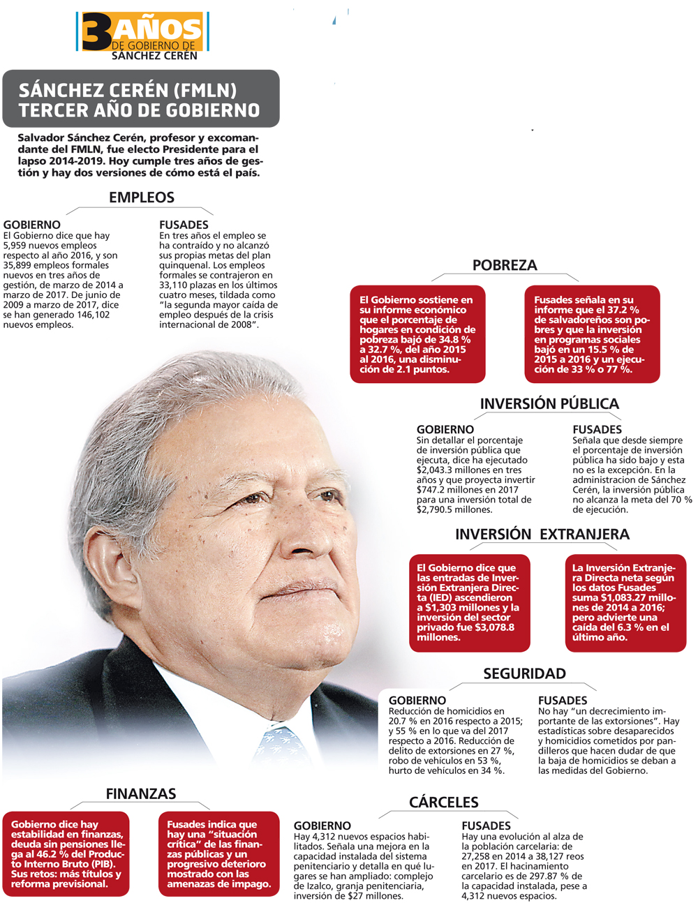 El presidente de la República, Salvador Sánchez Cerén, se prepara a dar hoy el informe de su tercer año de gestión como titular del Poder Ejecutivo ante la Asamblea Legislativa, bajo la sombra de dos visiones casi opuestas sobre el empleo, la seguridad, la inversión y la situación general de El Salvador.