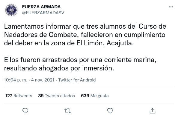 La Fuerza Armada de El Salvador informó a través de sus redes sociales sobre el fallecimiento de tres jóvenes, alumnos del curso de Nadadores de Combate, tras ser arrastrados por el mar en Acajutla, Sonsonate.