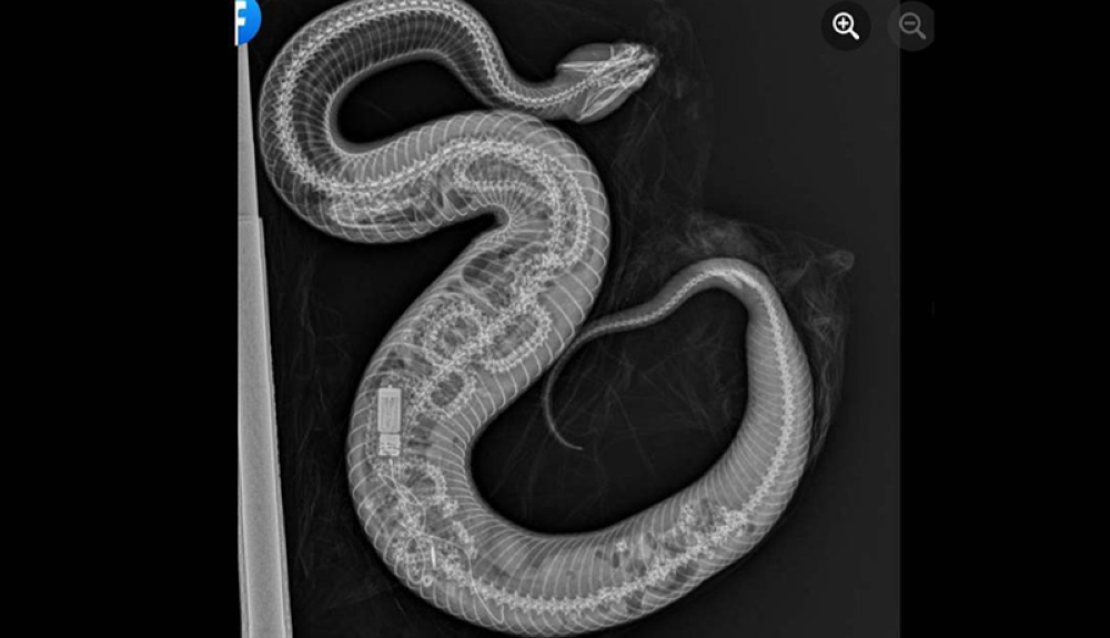 El transmisor de la pitón que le implantaron al reptil cirujanos del Zoo Miami, se encendió como un árbol de Navidad en los rayos X que se le tomaron, publicó El Nuevo Herald.