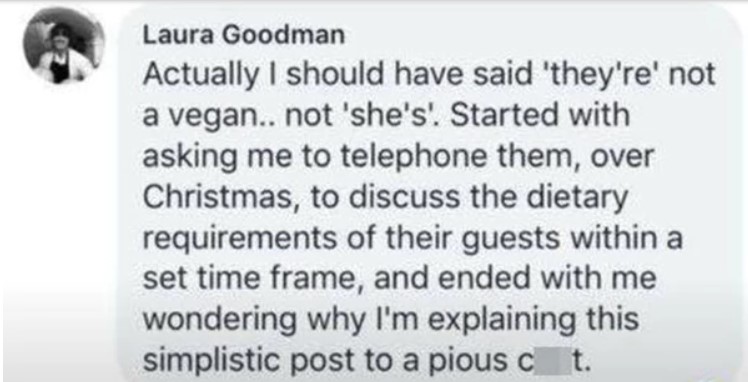 Laura Goodman publicó "Una crítica cliente vegana (para quien estuve trabajando todo el día) acaba de irse a dormir pensando que sigue siendo vegana", pero en realidad, ella le sirvió productos no veganos, porque fue, de acuerdo a lo que explicaron luego, lo que ellos mismos le pidieron, pues estaba en el menú.
