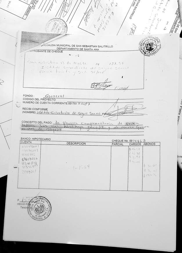 El viceministro mostró los vales del pago de las cuotas de ISSS y AFP de los empleados municipales.
