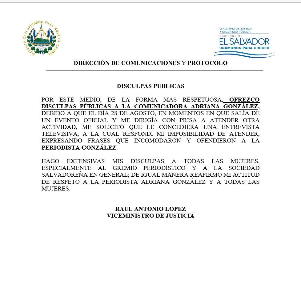 "Hago extensivas mis disculpas a todas las mujeres especialmente al gremio periodístico y a la sociedad salvadoreña en general, de igual manera reafirmo mi actitud de respeto a la periodista Adriana González y a todas las mujeres", dice el comunicado.