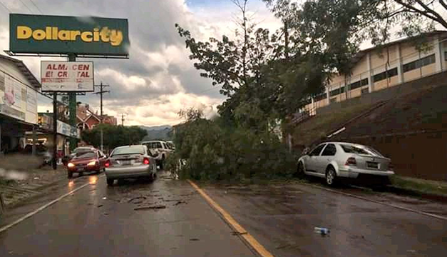 Los fuertes vientos por el que la autoridades emitieron un aviso la tarde de este sábado, dejaron daños en cables, caída de árboles y derribo de valla publicitarias en diferentes puntos de la ciudad de Santa Ana.