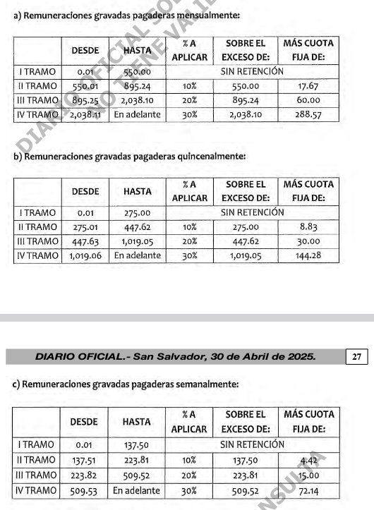 Tablas de retención aprobadas en el decreto del Ministerio de Hacienda firmado por el presidente Nayib Bukele y el ministro de Hacienda, Jerson Posada.