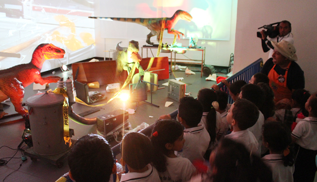 La innovadora muestra –que cuenta con ambientación y sonidos al estilo jurásico– incluye vídeo mapping en 360 grados (técnica que proyecta imágenes sobre superficies reales inanimadas para conseguir efectos de movimiento), además de pantallas touch con juegos como “dinotrivias” y “dinoparejas” para que los niños puedan aprender sobre las características y datos curiosos de cada especie de dinosaurios según su alimentación, morfología, el porqué de su extinción, entre muchas cosas más.
