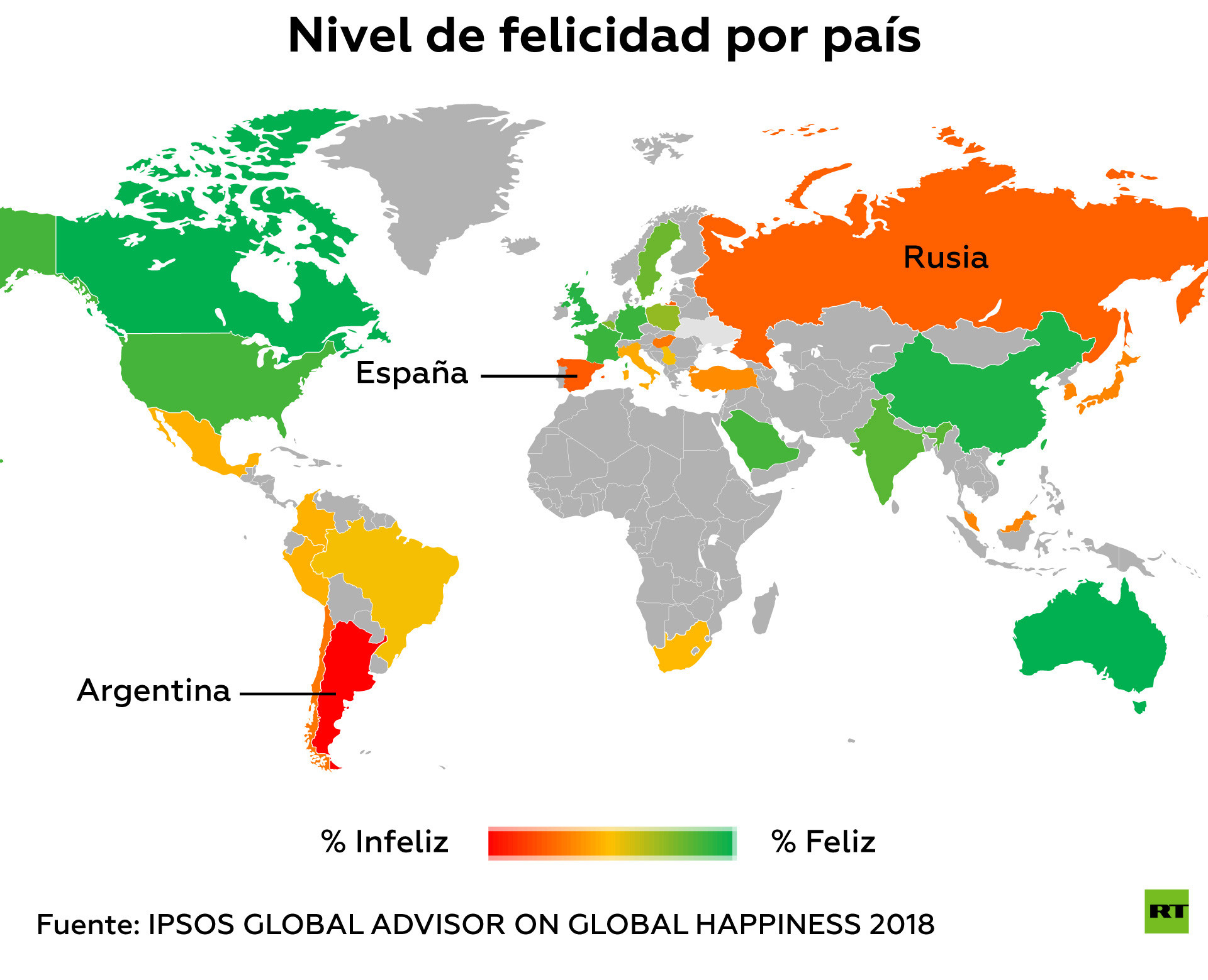 La encuesta se realizó a 28 naciones, en las que los países más infelices del mundo resultaron ser Argentina (34 % de ciudadanos felices), España (46 %) y Rusia (47 %).