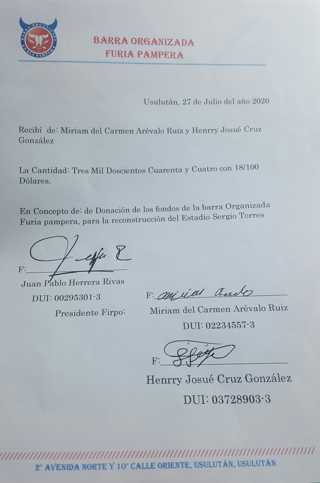 La afición de L.A. Firpo denominada “Furia Pampera” entregó 3 mil 244 dólares a la dirigencia taurina con el objetivo de apoyar a la reconstrucción del estadio Sergio Torres Rivera que sigue avanzando con el nuevo proyecto de llegar a ser protagonista en el próximo torneo Apertura 2020.