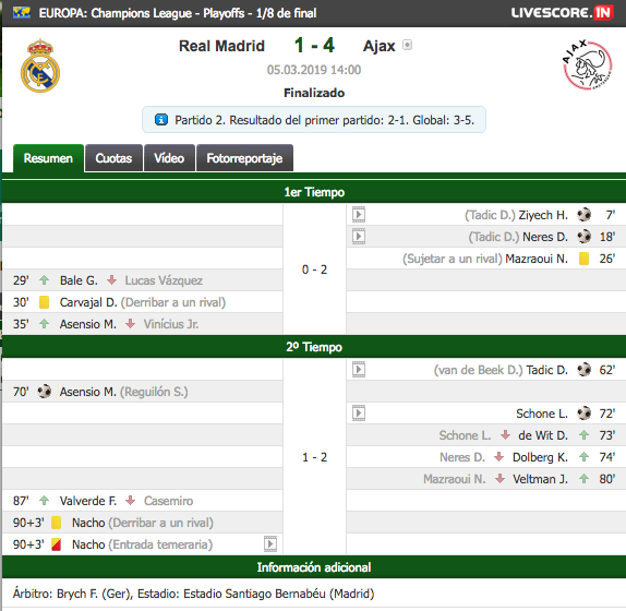 Los goles de Hakim Ziyech (7), David Neres (18), Dusan Tadic 3-0 (65) y Lasse Schone (72), llevaron al Ajax a los cuartos de final del torneo continental, sin que de nada sirviera el gol testimonial de Marco Asensio (70).