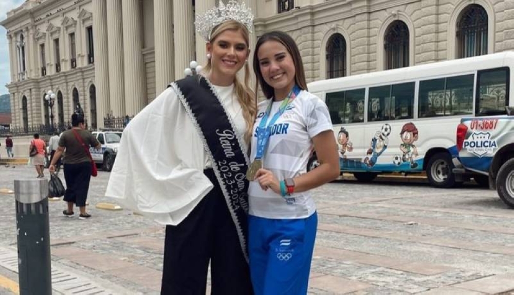 La karateca salvadoreña, Gabriela Izaguirre, quien ganó medalla de oro en los Juegos Centroamericanos y del Caribe San Salvador 2023, compartió el día de ayer con la reina de las Fiestas Agostinas 2023, Amanda Carballo, en un recorrido efectuado en el Centro Histórico en la celebración de la Policía Nacional Civil (PNC).