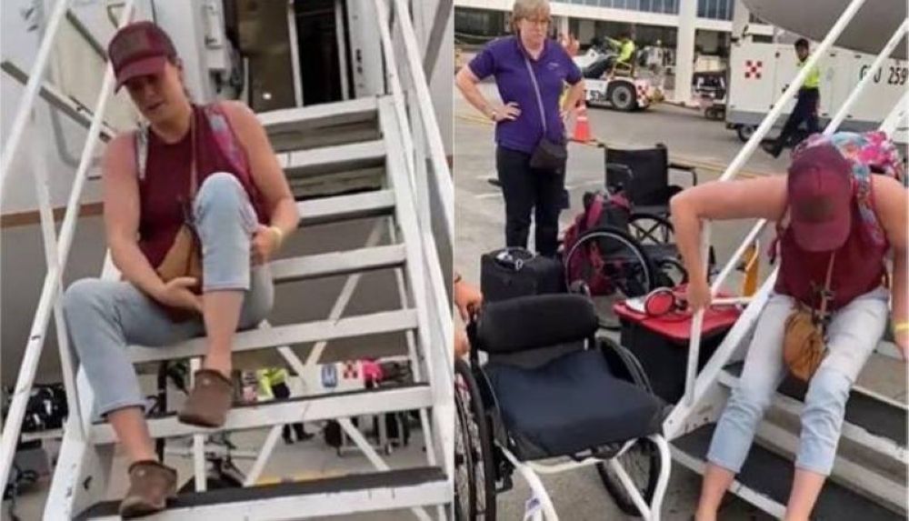 Esto ocurrió en el aeropuerto internacional Heriberto Jara Corona de Veracruz y de inmediato, las críticas no se hicieron esperar. Kayla tuvo que bajar sentada escalón por escalón hasta llegar a la silla de ruedas al final de la escalera.
