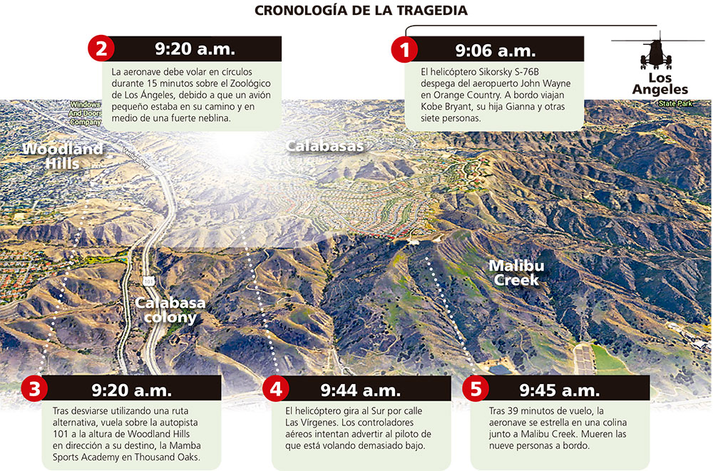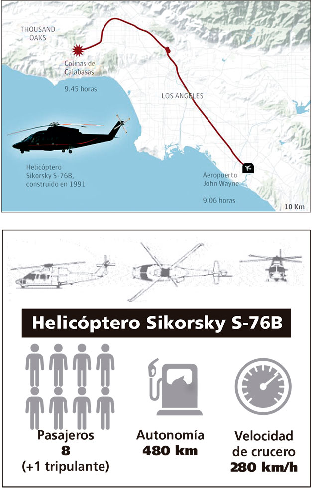Según el periodista Mauricio Cárdenas, el helicóptero, un Sikorsky S-76B construido en 1991, partió del aeropuerto John Wayne a las 9:06 de la mañana, según los registros de vuelo. Luego sobrevoló la ciudad de Los Ángeles de sur a norte rumbo a El Monte sin reportar accidente alguno.