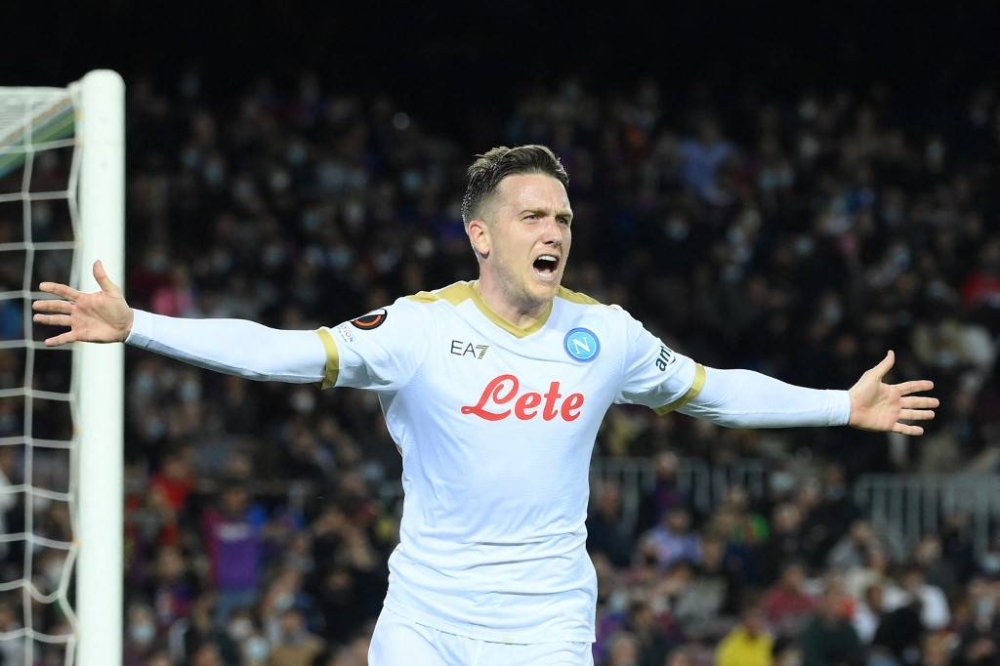 Napoli's Poland's midfielder Piotr Zielinski celebrates scoring his team's first goal during the Europa League football match between FC Barcelona and SSC Napoli at the Camp Nou stadium in Barcelona on February 17, 2022. (Photo by LLUIS GENE / AFP)