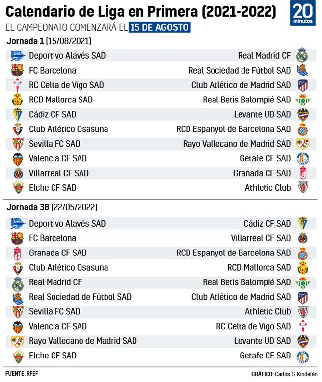 La Federación Española de Fútbol (RFEF) dio a conocer el calendario de la temporada 2021-2022 donde en la primera jornada Real Madrid visitará al Alavés y el Barcelona recibirá a la Real Sociedad, que comenzará el fin de semana del 15 de agosto y finalizará el 22 de mayo de 2022.