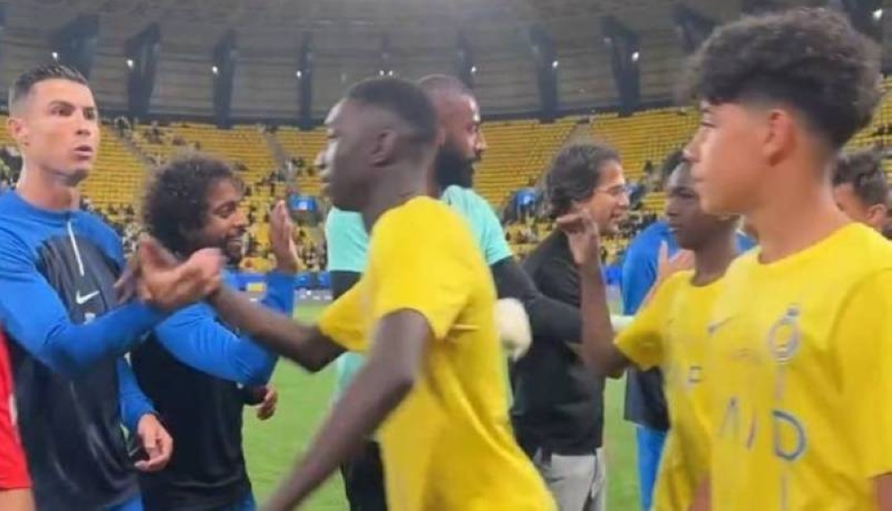 El hijo mayor de Cristiano juega en la categoría Sub-13 del Al Nassr y en medio de un festejo, fue evidente el momento en el que Ronaldo, en tono fuerte, le reprocha a su hijo por no acercarse, mientras el resto de compañeros sí saluda a los profesionales del cuadro árabe.