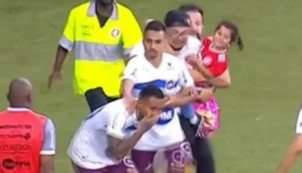 Pero lo que podría ser una fuerte pelea generalizada de la que hay muchos antecedentes en el fútbol continuó con un episodio insólito: un torcedor del Inter ingresó con su bebé en brazos a la cancha y le pegó una patada espalda por la espalda y sobre los testículos a Dudu Mandai. Y como si esto solo no resultara increíble, el futbolista agredido agarró la mochila de la pequeña, mientras el hincha agresor le reclamaba la devolución. A Dudu lo fueron a buscar algunos auxiliares del Inter, uno agarró la mochila y se la devolvió a la niña.