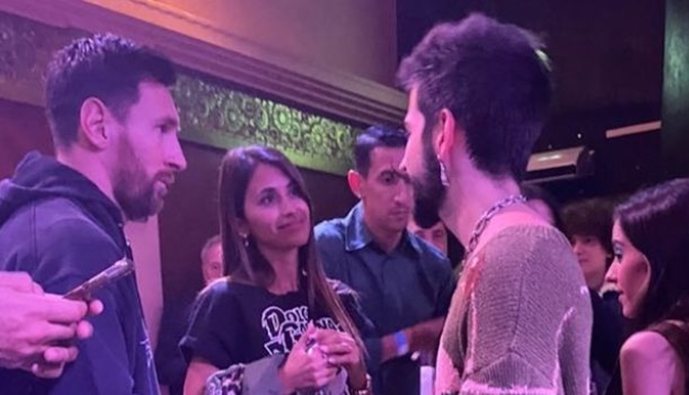 La foto contrasta fuertemente con la del artista, que de manera insólita aparece charlando con Messi apoyando sus pies descalzos sobre la pista del lugar. Raro.