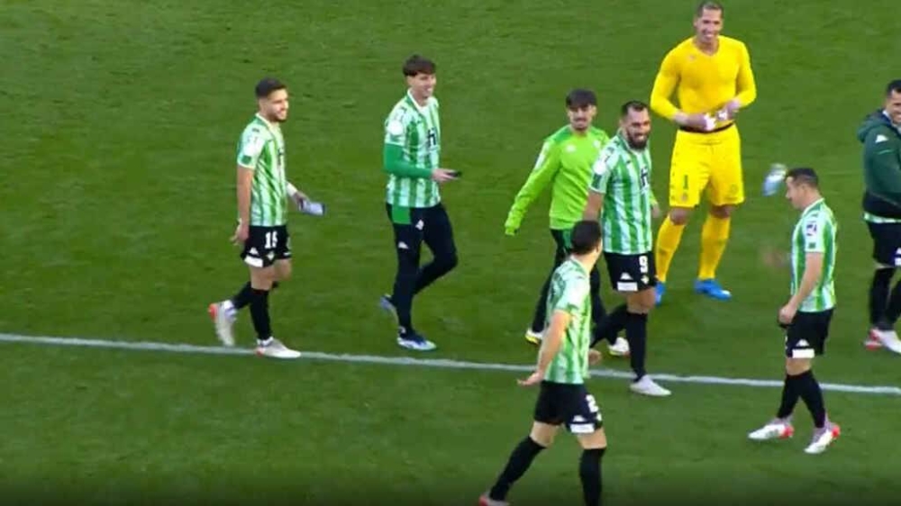 En medio de la celebración del Real Betis, que le ganó 2-1 al Sevilla, un gesto de Andrés Guardado fue captado por la producción, cuando simula un golpe con una botella y cae al césped.