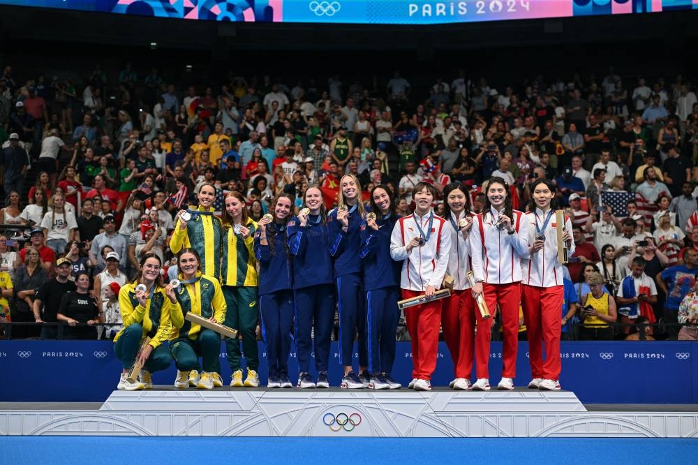 Estados Unidos y China en el podium de natación, junto con las nadadoras australianas. / AFP