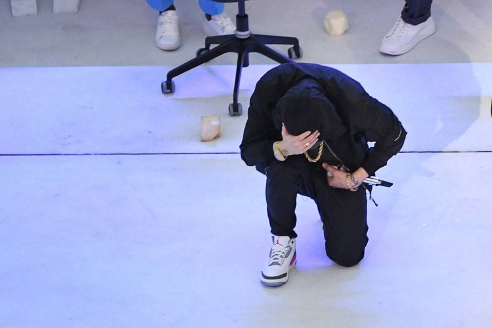 Algo que no pasó desapercibido fue el momento en que Eminem se arrodilló justo cuando terminó de cantar su éxito 'Lose Yourself'. En ese instante Dr. Dre, quien estaba en una especie de consola gigante, cambió de lugar y se dirigió a tocar el piano. Mientras eso ocurría, el rapero de Misuri (EE. UU.) puso su rodilla izquierda en el suelo, agachó la cabeza y se la tocó con la mano derecha.