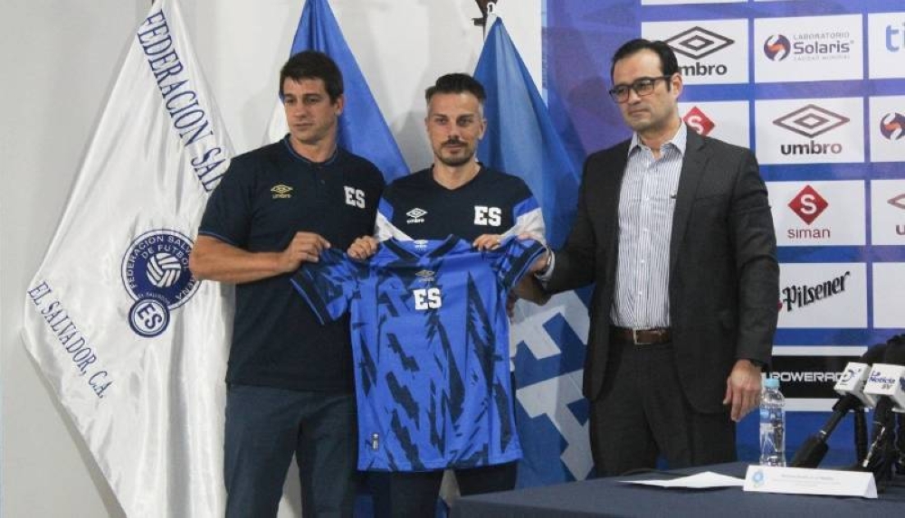 El presidente de la Comisión de Regularización de la Federación Salvadoreña de Fútbol, Humberto Sáenz Marinero junto al director de selecciones nacionales, Diogo Gama, presentaron al nuevo técnico de la Selecta, el español Rubén De La Barrera, en una conferencia realizada en las instalaciones de la FESFUT.
