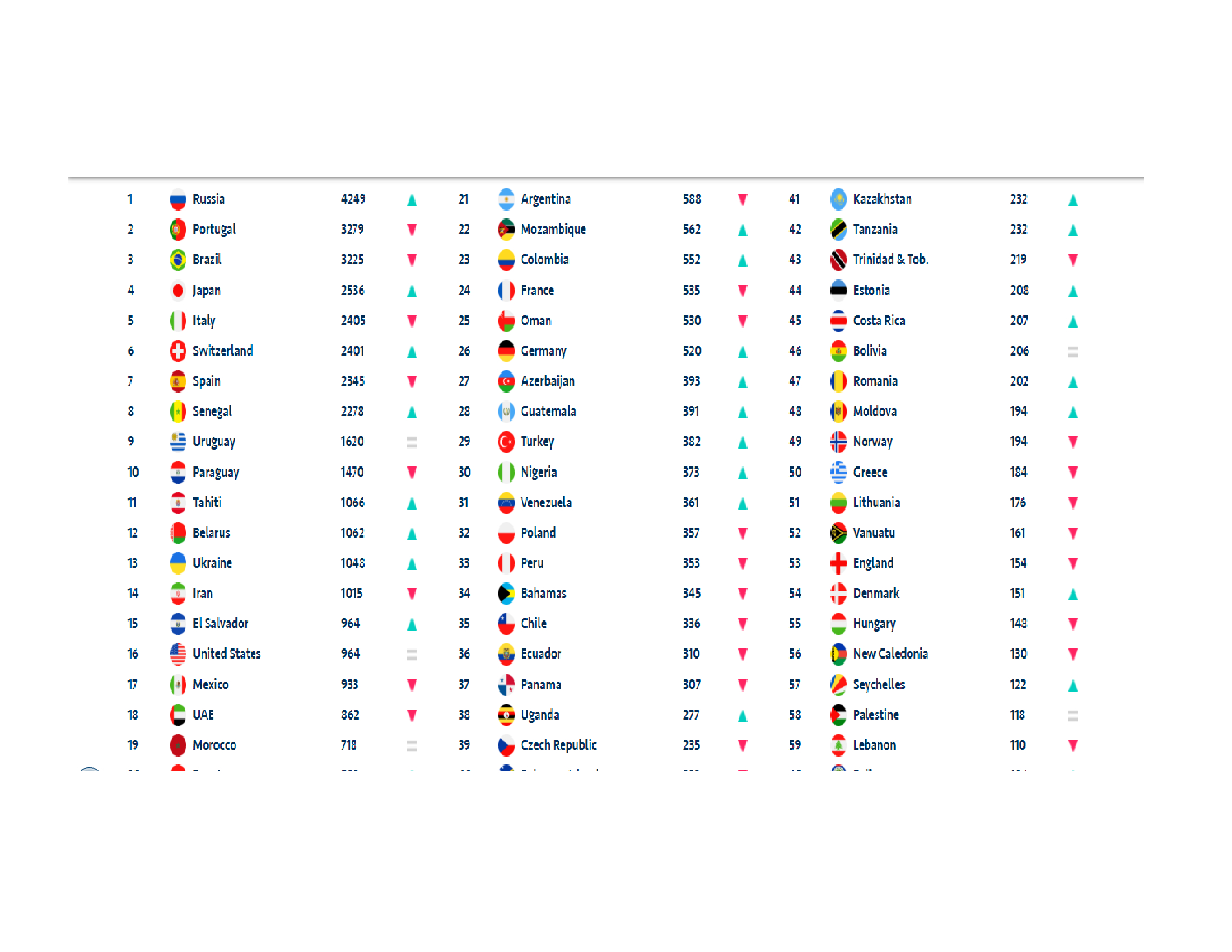 El ránking mundial de fútbol playa fue actualizado el pasado martes 7 de septiembre y los resultados arrojaron que El Salvador llegó a la posición 15 con 964 puntos por encima de Estados Unidos con las mismas unidades y México dos puestos abajo con 933. Por su parte, el podio de esta lista lo dirige la campeona de la modalidad y anfitriona de la reciente justa playera, Rusia con 4 mil 249 puntos, seguida de Portugal con 3 mil 279 y Brasil en la tercera plaza con 3 mil 225 puntos.