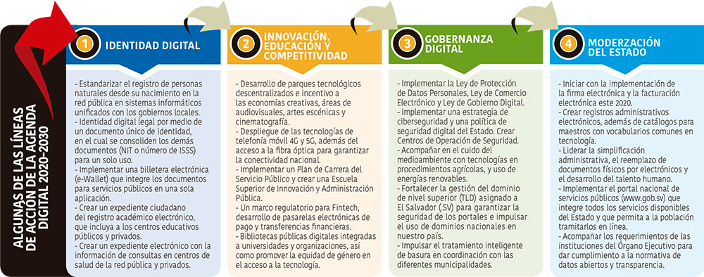 En esta iniciativa se contempla en el eje de Identidad Digital la creación de expedientes ciudadanos electrónicos, uno académico y otro de salud, que abarquen las instituciones públicas y privadas. En Modernización del Estado, según indica el documento de la agenda, se trabajará para crear una sola ventanilla para trámites empresariales, en la implementación de la factura y la firma electrónica para el primer semestre de 2020, así como en reemplazar los documentos físicos por digitales.
