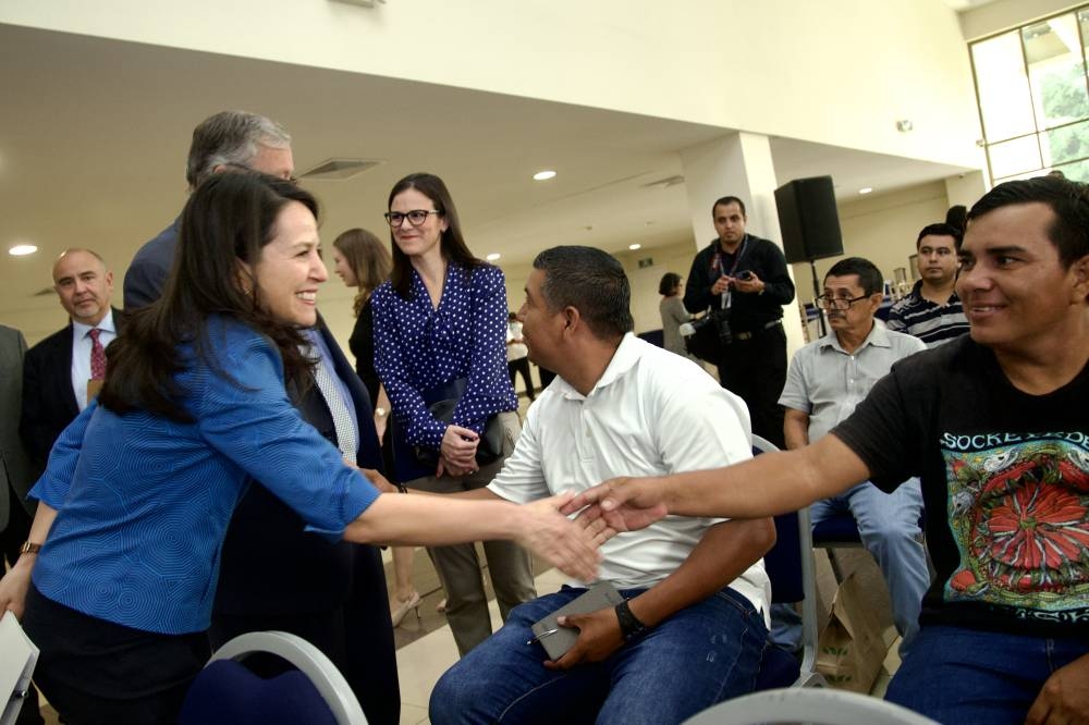 La administradora adjunta para América Latina y el Caribe de USAID, Marcela Escobari, saluda a beneficiados del programa de migración. /Cortesía EE. UU.