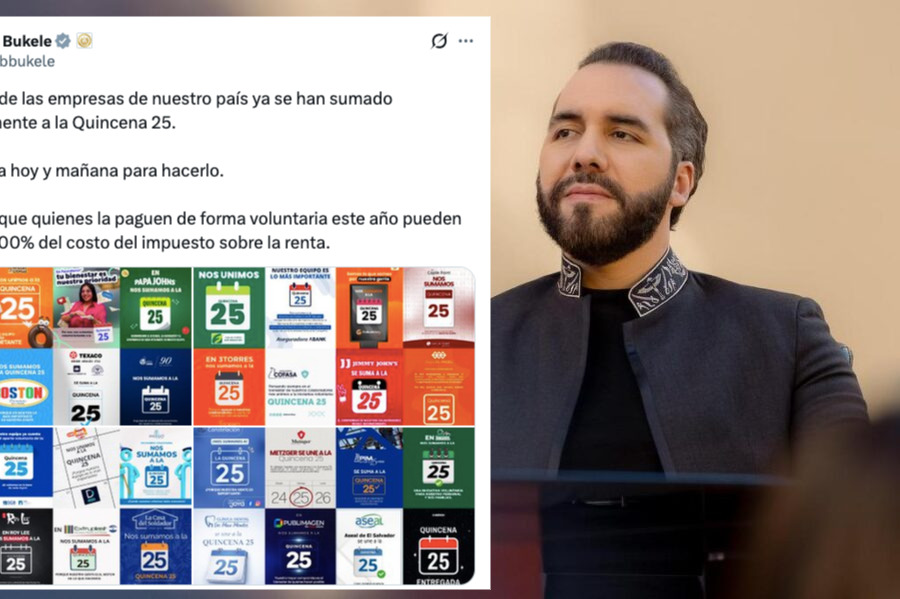 El presidente salvadoreño, Nayib Bukele, aseguró este sábado que «a mayoría de las empresas de nuestro país ya se han sumado voluntariamente a la Quincena 25», una remuneración adicional de medio salario que pueden realizar voluntariamente las empresas privadas y debe realizar obligatoriamente el Estado a los trabajadores.