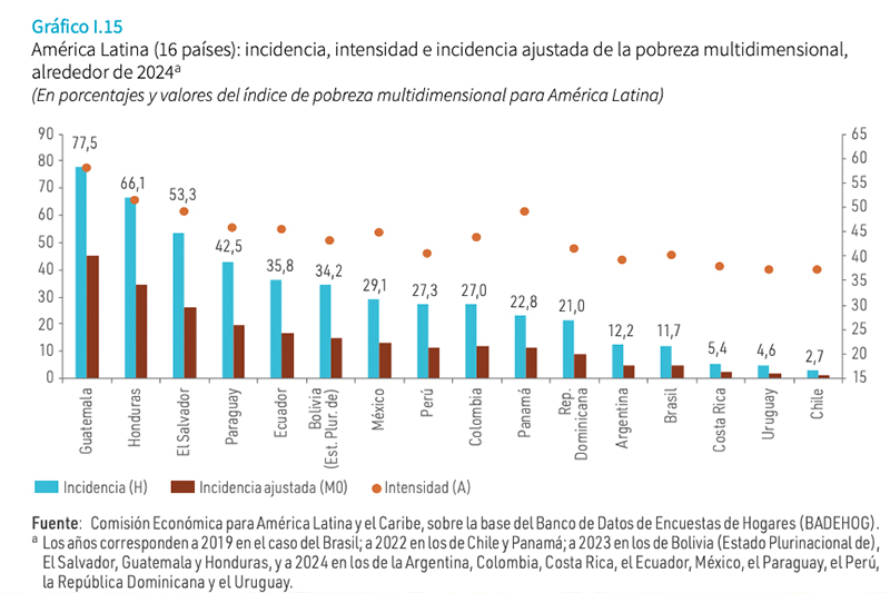 En el Panorama Social de América Latina y el Caribe 2025, publicado el 26 de noviembre, los países de la región muestran una “amplia” heterogeneidad en los niveles de pobreza multidimensional. Guatemala, Honduras y El Salvador registran las mayores tasas, todas por encima del 50 %.