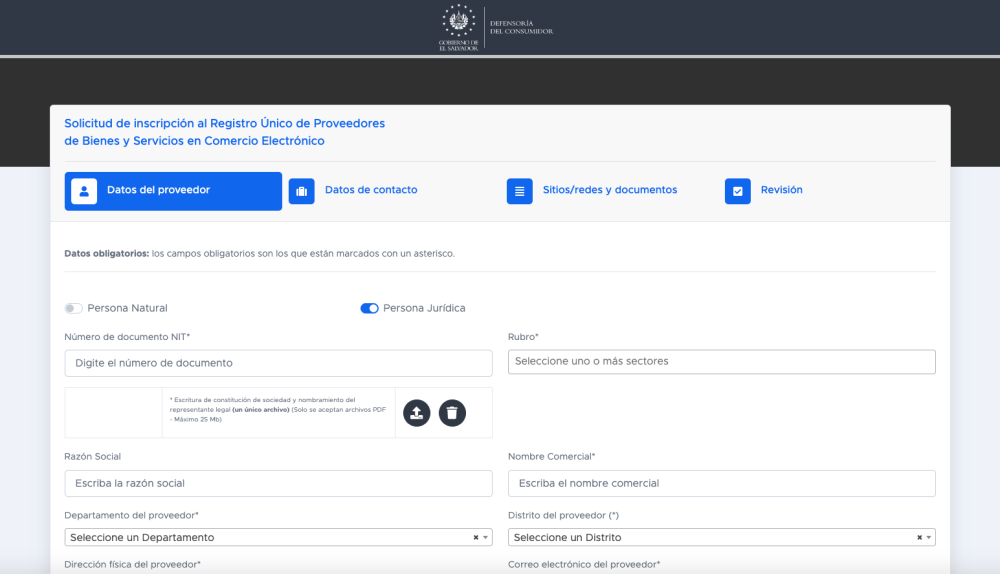 Para inscribirse es necesario que las empresas ingresen al portal web habilitado por la Defensoría, en donde las personas deberán otorgar el nombre del propietario del comercio y de la empresa, la dirección URL o el nombre de la aplicación o plataforma.Las empresas a cargo de personas naturales también necesitan proporcionar un correo electrónico, dirección física del proveedor, persona de contacto, número de teléfono, copia de DUI o carné de residencia, así como documentación que ampare la contratación o registro del dominio.