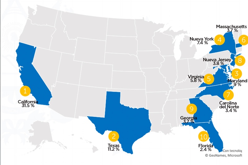 Luego se ubican Nueva York (7.4 %), Virginia (5.8 %), Massachusetts (3.7 %), Carolina del Norte (3.4 %), Nueva Jersey (3.8 %), Georgia (2.7 %) y Florida (2.4 %). El resto de estados concentran el 17 %.