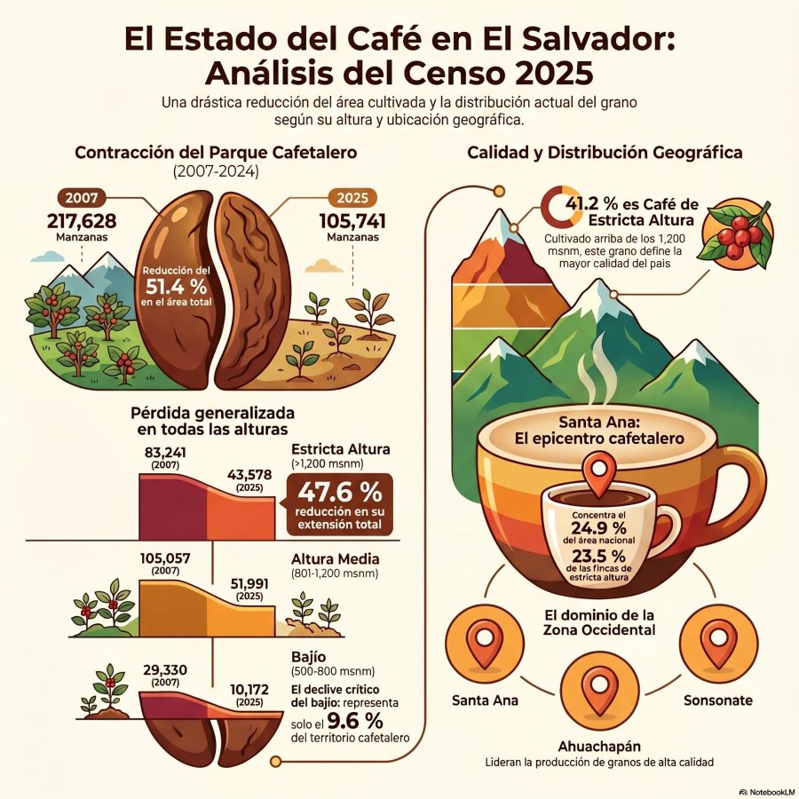Según el documento, publicado por el Banco Central de Reserva (BCR), el área total cultivada de café fue de 105,741 manzanas en el ciclo 2023-2024. Esto significó una reducción de 111,887 manzanas (51.4 %) en comparación con las 217,628 manzanas reportadas en el Censo 2007.