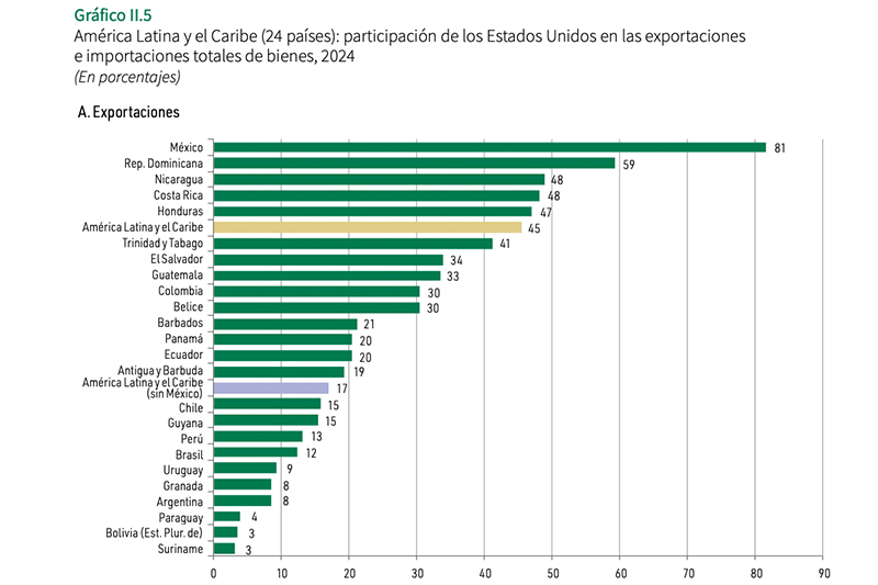 De los 24 países analizados con datos al cierre de 2024, México tiene la mayor concentración de sus exportaciones hacia la gran economía del mundo, con un 81 %, seguido de República Dominicana con un 59 %.