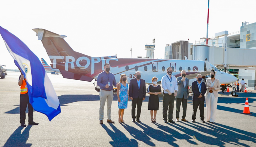 En la nueva terminal del Aeropuerto Internacional de El Salvador San Óscar Arnulfo Romero fue recibido, la tarde de este viernes, el primer vuelo de la aerolínea beliceña Tropic Air, que tiene previsto mantener tres vuelos sin escala a la semana entre San Salvador y Belice.