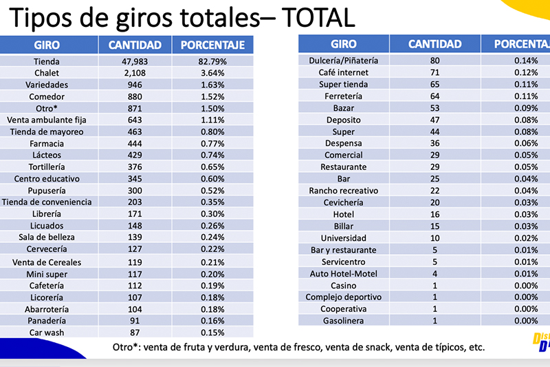 Además, se identificaron 643 ventas ambulantes, 463 tiendas de mayoreo, 444 farmacias, 429 ventas de lácteos y 376 tortillerías.