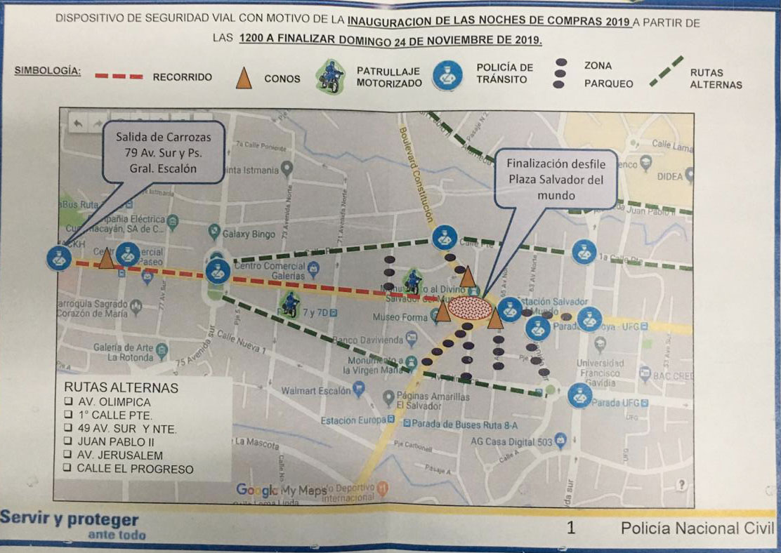 La Policía Nacional Civil (PNC) confirmó que desplegará agentes durante el recorrido y en las actividades de la plaza. Además se contará con la presencia de oficiales de la División de Armas y Explosivos, así como de la División de Tránsito, Bomberos, Protección Civil, Cuerpo de Agentes Metropolitanos y el Instituto Municipal de Deportes de San Salvador.