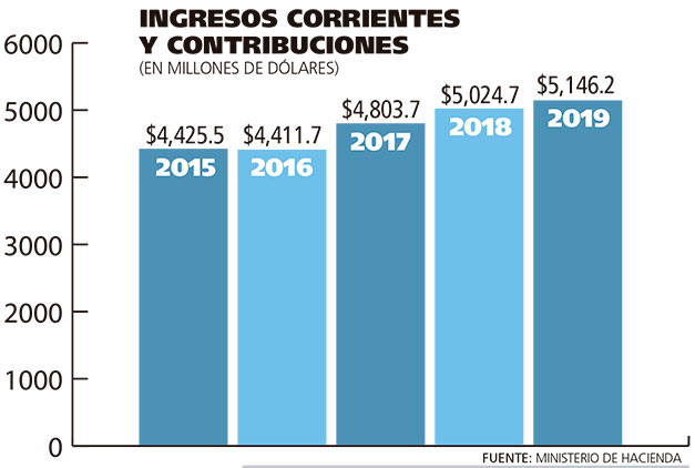 Los datos oficiales del Ministerio de Hacienda revelan que, al término de 2019, los ingresos corrientes y contribuciones representaron un 2.4 % de crecimiento frente a los $5,024.7 millones de 2018. Respecto a 2017, los ingresos que registró el Gobierno superaron en $342.5 millones a los $4,803.7 millones de ese año.