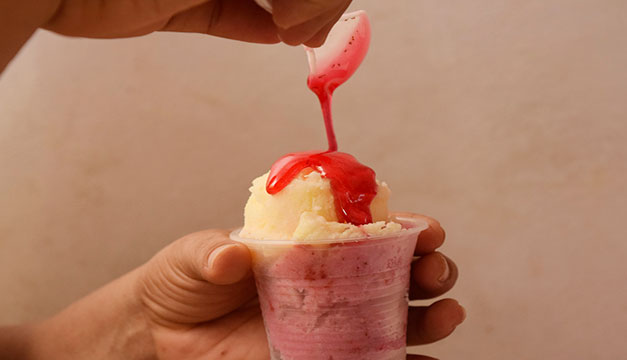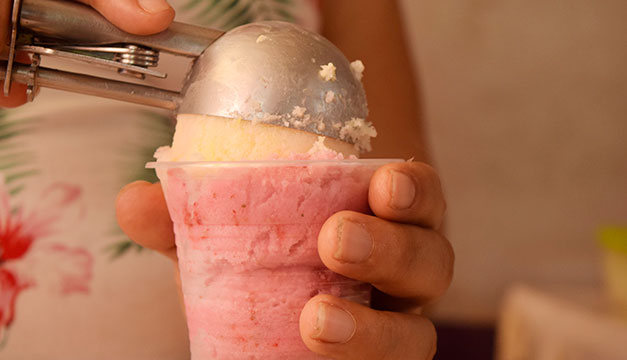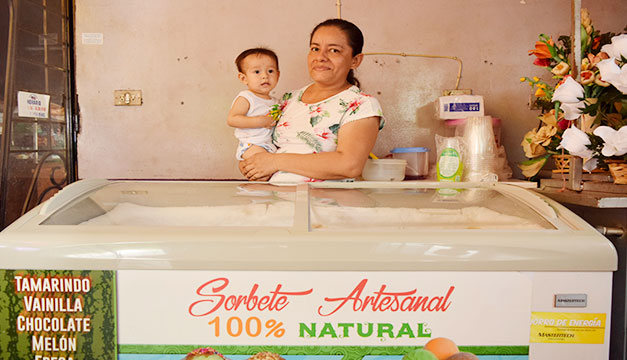 Esta salvadoreña, originaria de San Rafael Obrajuelo, aprendió a elaborar sorbete artesanal desde hace dos años, a través de una capacitación que brindó Insaforp, en conjunto con Ciudad Mujer; posterior a eso comenzó a emprender y como no podía adquirir una máquina para hacer sorbete, pues tenía un costo aproximado de $90 en el mercado, decide utilizar dos ollas de acero inoxidable para trabajar su producto. Coloca el hielo con sal en la más grande y, sobre ésta, posiciona la olla más pequeña, donde procede a colocar la fruta para elaborar el sorbete.