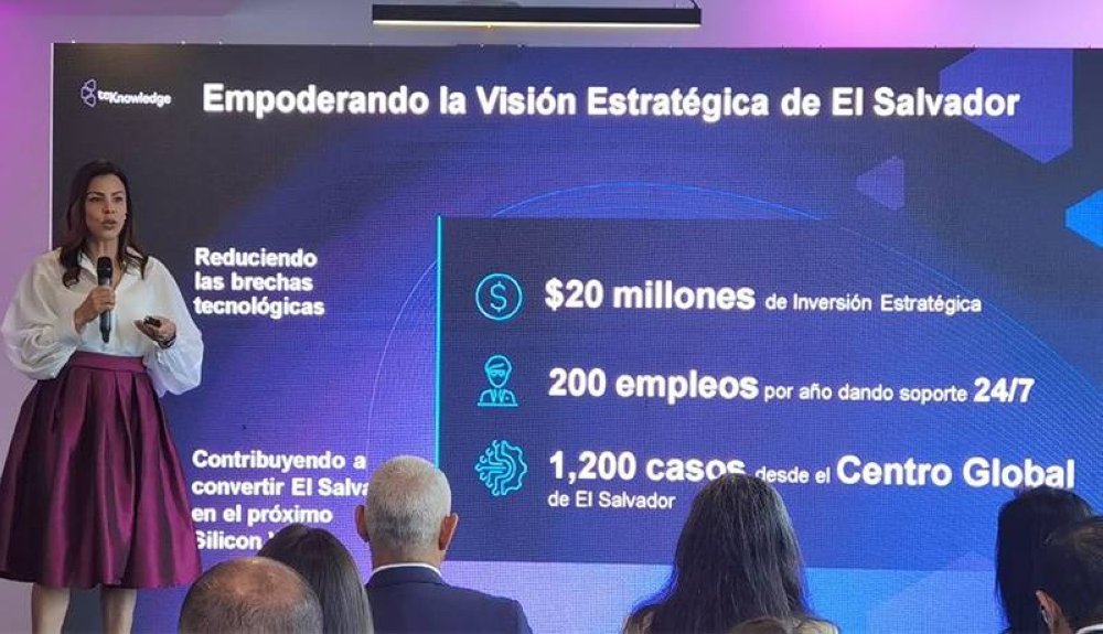 La firma busca contribuir al desarrollo de un “hub” en El Salvador para aumentar la “competencia digital”, así como “ser un motor de crecimiento e innovación”, dijo María Balbás, vicepresidenta ejecutiva de TeKnowledge, previo al corte de cinta de inauguración de la oficina de la compañía en San Salvador.