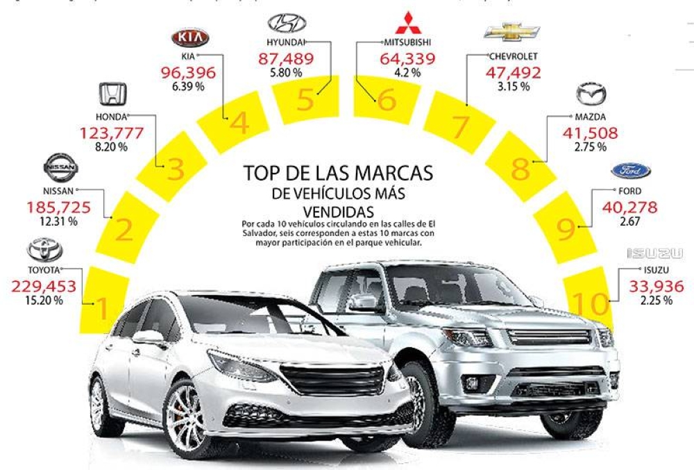 Dentro de las más de 100 marcas con registros en El Salvador, el fabricante japonés Toyota lidera el mercado local con una participación del 15.20 % del parque vehicular y tiene en circulación unas 229,453 unidades.
