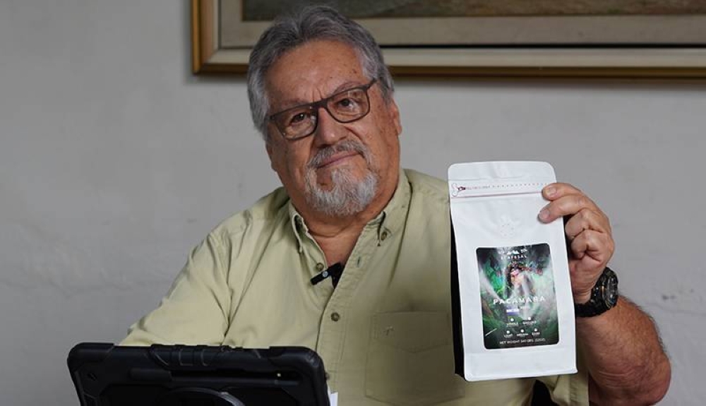 Sergio Ticas, presidente de Acafesal, muestra una presentación de café que se exporta a EE. UU. con el logo de la gremial. /Francisco Valle