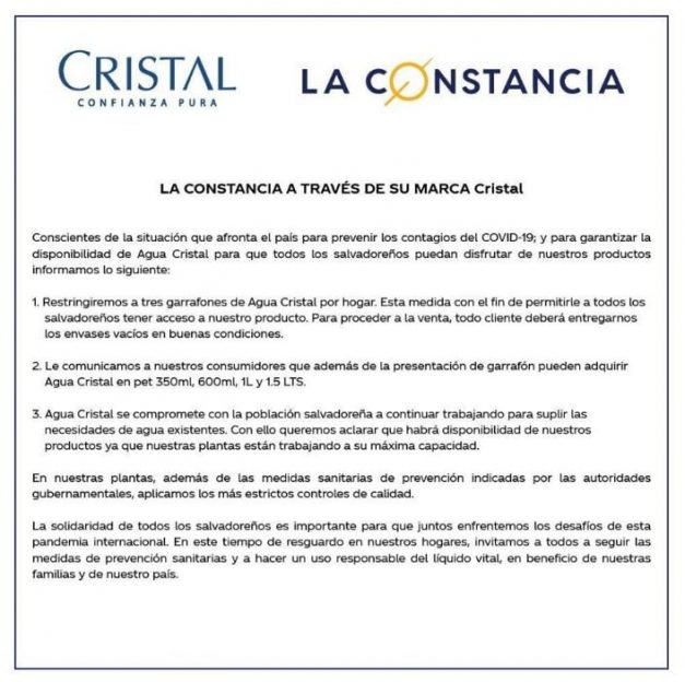 La embotelladora sostiene que busca garantizar la disponibilidad de agua purificada. "Restringiremos a tres garrafones de Agua Cristal por hogar. Esta medida con el fin de permitirle a todos los salvadoreños tener acceso a nuestro producto", dice la compañía en un comunicado publicado en su cuenta en Facebook.