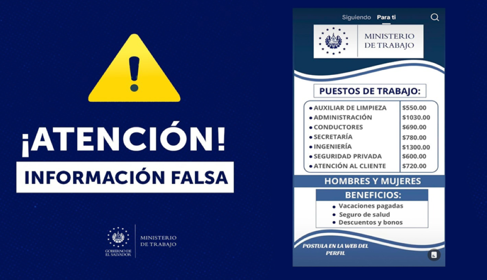 El Ministerio de Trabajo y Previsión Social alertó, este domingo, a la población salvadoreña a no ser víctima de engaños con falsas oportunidades laborales que circulan en redes sociales, las cuales aseguraron que son ofertas de trabajo con “información falsa”.