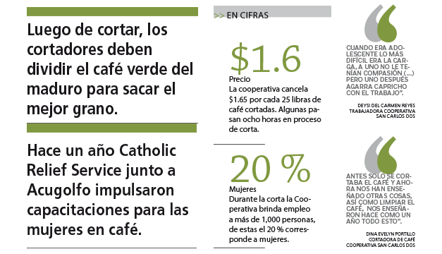 Israel Márquez, presidente de la Cooperativa San Carlos Dos, indicó que en cada cosecha y época de corta, de diciembre a febrero, “se necesitan más de 1,000 trabajadores” tanto para las fincas y patios de secado, como para el beneficio. Un 20 % de los colaboradores corresponde a mujeres, aseguró.