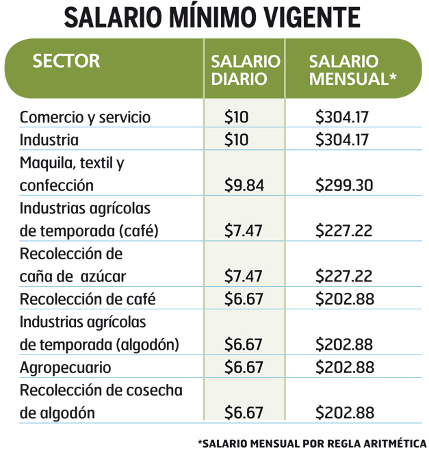 Por ejemplo, para el rubro de comercio el salario mínimo en 2017 era de $300, con un sueldo diario de $10. Con la nueva fórmula, el promedio anual para un trabajador es de $3,650 y dividido entre los 12 meses del año, le da un sueldo mensual de $304.17, no los $300 que antes se pagaba.
