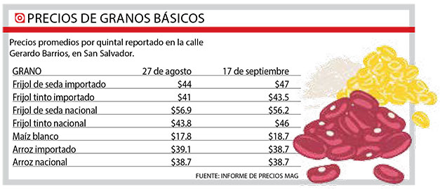 El informe diario de precios de los productos agropecuarios, elaborado por el Ministerio de Agricultura y Ganadería (MAG), reporta que el 27 de agosto pasado el precio del quintal de frijol rojo de seda importado tenía un costo promedio de $44, pero al 27 de septiembre se colocó en $47 con un incremento de 6.8 %.
