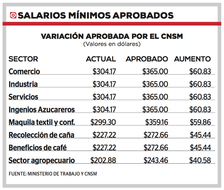 En total, el CNSM revisó los salarios de ocho sectores: comercio; servicios; industria; maquila textil y confección; sector agropecuario; beneficios de café; recolección de caña de azúcar e ingenios azucareros.