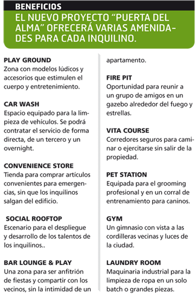“Puerta del Alma” se ubicará en los alrededores de una zona variada en comercio y actividades lúdica, aunque el proyecto constará con sus propias áreas de esparcimiento, como una piscina, fogata o gimnasio.