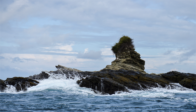 Gorgona, que tomó su nombre de la Medusa de la mitología griega, asoma como una masa oscura y casi lúgubre. Nubes grises se posan sobre sus montañas volcánicas de selva espesa. Abajo delfines y ballenas jorobadas retozan. Llueve a diario.